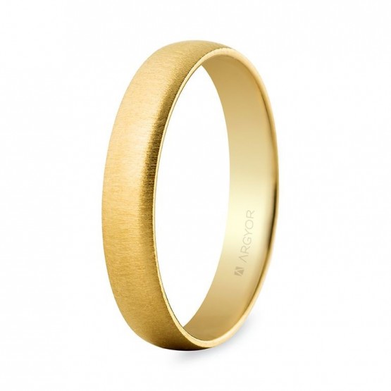 Alianza de boda de oro 18 quilates realizada a partir de una media caña de 4 milímetros clásica, donde la superficie cambia y reduce brillo para ganar matices gracias a un estriado horizontal que le otorga esa textura especial. Disfruta de un abombado interior que la hace más cómoda.