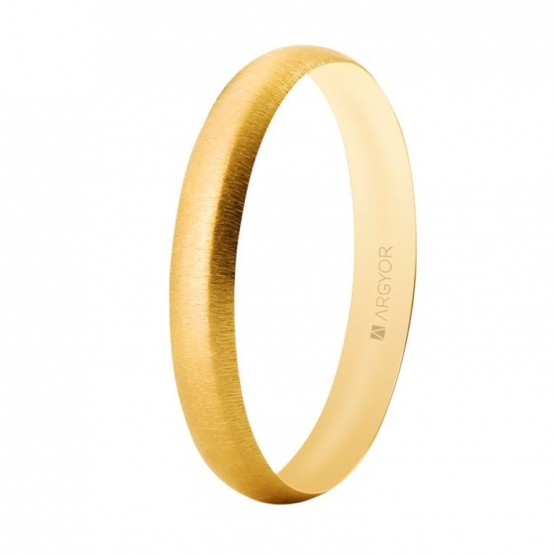Alianza de media caña e interior ligeramente bombeado, en oro de 18k, perfecta para quienes prefieran las alianzas de boda de estilo clásico y busquen elegancia y comodidad. Ahora mucho más actual gracias a nuestra textura especial: un estriado de suaves trazos horizontales hecho de manera artesanal.