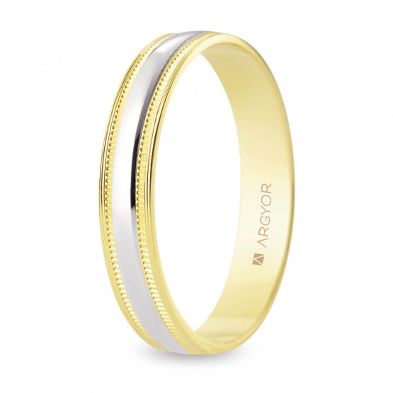 Alianza de boda de diseño Argyor realizada en 2 oros de 18 quilates, de 4 milímetros de ancho. Esta joya tiene un acabado combinado labrado en el anillo de oro amarillo y brillante en el anillo de oro blanco en la parte central. Haz de tu día un recuerdo inolvidable con esta joya de diseño.