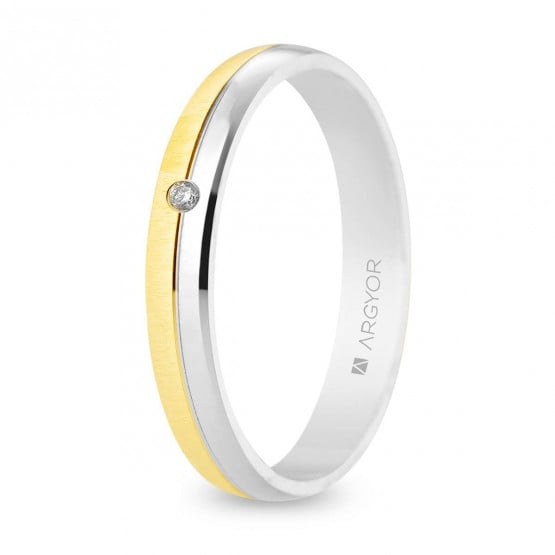 Alianza de boda bicolor amarillo/Blanco de diseño original en oro de 18k y 3,5 mm de ancho. Este anillo de boda tiene un elegante acabado satinado en el que destaca su brillante bisel central, separando sus dos mitades de oro blanco y amarillo. Cuenta con un diamante brillante (redondo) de 0,015 ct.Como el resto de joyas de la colección, este anillo de oro está diseñado y fabricado en España