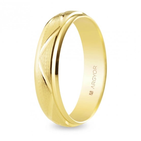 Alianza de oro de 18 quilates de diseño original del catálogo ARGYOR. Según el diccionario, zigzag es ‘una línea que en su desarrollo forma ángulos’. Nuestra interpretación se plasma en esta joya, que luce en su banda central un acabado estriado mate y la mencionada línea en acabado brillante, al igual que los laterales del anillo. Disponible también en oro blanco y en dos oros: blanco y amarillo. Se trata de un modelo de éxito gracias a su equilibrado diseño, que resulta discreto a pesar de su originalidad.