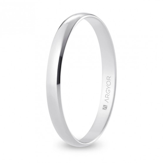 Alianza de boda clásica media caña, fabricada en oro blanco de 9 y 18 quilates, de 2,5 mm de ancho e interior plano.Este diseño, de los más finos y ligeros de la colección, posee un espectacular acabado brillo.Descubre otros acabados en nuestro configurador de alianzas clásicas.