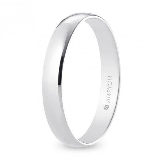 Alianza de boda clásica, estilo media caña de 3,5 mm de anchura e interior plano. Esta joya luce un excelente acabado pulido, que le aporta un intenso brillo, y se remata con un baño de rodio que la protege y refuerza su blancura.Fabricada en oro blanco de 9 y 18 quilates. Disponible con diamantes en nuestro configurador de alianzas clásicas.Antigua referencia 5B353
