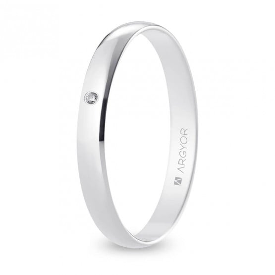 Alianza de boda clásica, estilo media caña, con una anchura de 3 mm e interior plano. Su extraordinario acabado pulido/brillo se ve potenciado con el diamante de 0.01 ct que lleva engastado, talla brillante, color H y pureza SI. Disponible en oro blanco de 9 y 18 quilates.Visita nuestro configurador para descubrir esta joya con otro acabado. Este modelo corresponde a la antigua referencia 5B302D