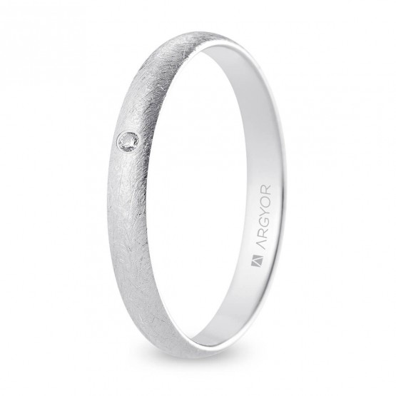 Alianza de boda clásica en oro blanco, de 3 mm de anchura, estilo media caña, con un diamante engastado de 0.015ct, talla brillante, pureza SI y color H.Gracias a un limado especial se consiguen crear estas bonitas marcas inspirados en la textura del hielo.Su interior redondeado te ofrecerá un mayor confort. Fabricada en oro blanco de 9 o 18 quilates.Esta alianza forma parte del configurador de alianzas clásicas. ¡Descúbrelo!