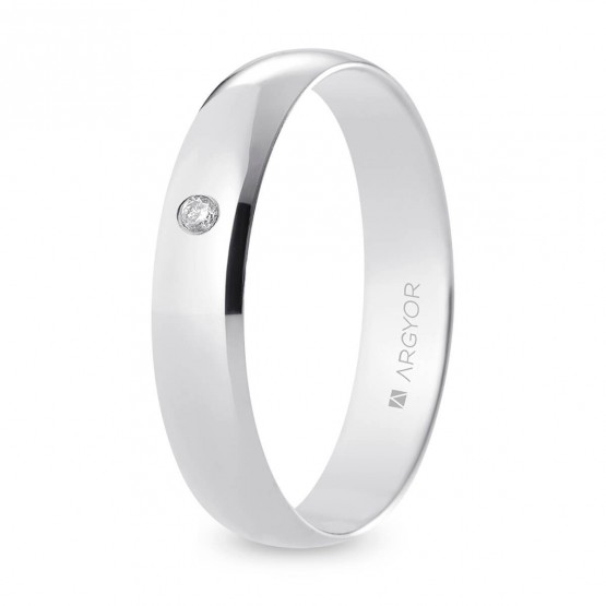 Alianza de boda clásica media caña, sus 4,5 mm de ancho la convierten en una de las de mayor anchura de nuestra colección. En su acabado superficial pulido resalta un diamante de talla brillante, 0.02 quilates, color H y pureza SI. Su interior confort es ligeramente redondeado.Disponible en oro blanco de 9 o 18 quilates. Descubre el resto de anillos en nuestro configurador de alianzas clásicas.