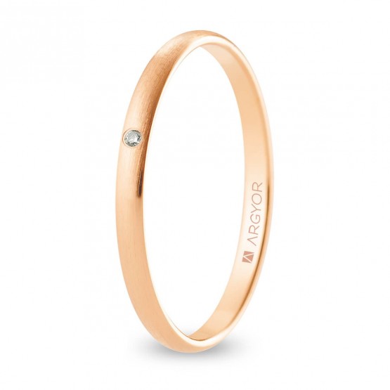 Alianza de boda clásica, estilo media caña, de 2 mm de anchura, la más fina y ligera de la colección clásica, fabricada en oro rosa de 18 quilates. Luce un diamante de 0.01ct, talla brillante, color H y pureza SI, engastado sobre un acabado satinado bellísimo.Este anillo tiene el interior ligeramente redondeado para ofrecerte mayor confort.Descubre otros acabados en el configurador de alianzas clásicas.