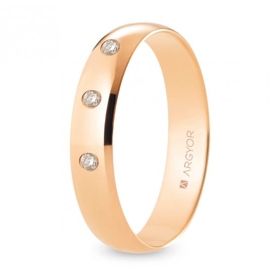 Alianza de boda clásica con diamantes, estilo media caña, en oro rosa pulido brillo de 18 quilates, es una de las de mayor anchura de nuestra colección con 4,5 mm. Destacan tres diamantes engastados; color H, pureza SI y talla brillante de 0.02 quilates cada uno, en total, 0.06 ct. Su interior redondeado te ofrecerá un mayor confort.Descubre este modelo sin diamantes en nuestro configurador de alianzas clásicas.