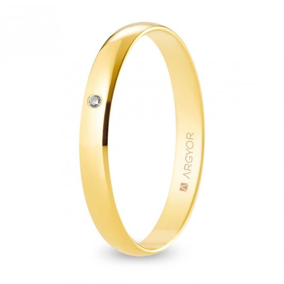 Alianza de boda clásica, estilo media caña, con una anchura de 3 mm e interior plano. Fabricada en oro amarillo de 9 y 18 quilates. Posee un extraordinario acabado pulido brillo con un bello diamante engastado, talla brillante, de 0.01 ct, color H y pureza SI .Visita nuestro configurador para descubrir el resto de alianzas clásicas. Este modelo sustituye al antiguo 50302D.