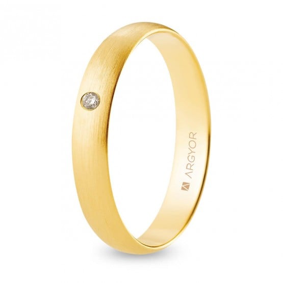 Alianza de boda clásica, media caña, en 4 mm de ancho, con un bellísimo acabado satinado de líneas verticales e interior redondeado confort. En esta joya resalta un bonito diamante; talla brillante, color H, pureza SI, de 0.02 ct.Disponible en oro amarillo de 18 y 9 quilates.Descubre otros acabados en el configurador de alianzas clásicas.