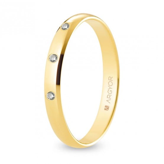 Alianza de boda clásica, en 3 mm de anchura, de estilo media caña, con tres diamantes engastados de talla brillante, de 0.015 quilates cada uno, en total 0.045 ct, color H y pureza SI.Su exclusivo acabado pulido en la parte superior le aporta un magnífico brillo y su interior confort una mayor comodidad.Disponible en oro amarillo de 9 y 18 quilates.Visita nuestro configurador para descubrir el resto de alianzas clásicas.