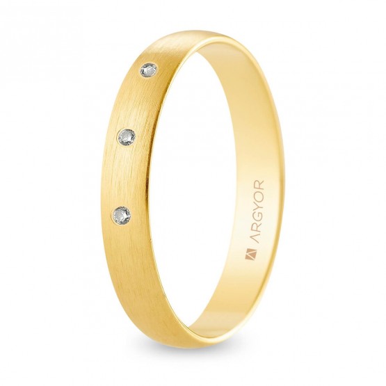 Alianza de boda clásica con diamantes, estilo media caña, con interior plano y 3,5 mm de anchura. Esta joya posee un bello acabado satinado sobre el que destacan tres diamantes engastados de talla brillante, de 0.01 quilates cada uno, 0.03ct en total, color H y pureza SIDisponible en oro amarillo de 18 y 9 quilates.Descubre este diseño sin diamantes en el configurador de alianzas clásicas.