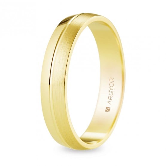 Alianza de oro amarillo de 18 quilates con forma de media caña. El diseño tiene 4 mm de ancho y doble acabado brillo/satinado separado por una elegante ranura. Esta moderna joya de oro será para toda la vida el símbolo de vuestro amor
