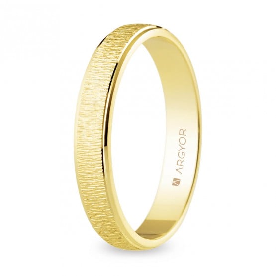Alianza de oro amarillo de 18 quilates y 3,5 mm de ancho. Este anillo de boda tiene biseles brillantes y un innovador acabado texturizado que imita el del papel crepé.Esta moderna joya de oro será para toda la vida el símbolo de vuestro amor.