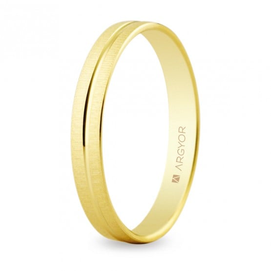 Preciosa alianza de oro Argyor con terminación texturizada. Con un suave acabado rugoso en su superficie junto a un fino bisel central de terminación brillante, este anillo de 9 o 18 quilates es uno de nuestros diseños estrella más originales. Merece la pena verlo en directo. Tiene una anchura de 3 mm y su interior es plano.