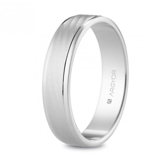 Alianza de oro blanco de 18 quilates y 4.5mm de ancho. El anillo de matrimonio tiene un elegante acabado mate texturizado con unas diagonales y bisel pulido brillante.Esta moderna alianza será el símbolo perfecto de vuestro amor, también disponible en oro amarillo.