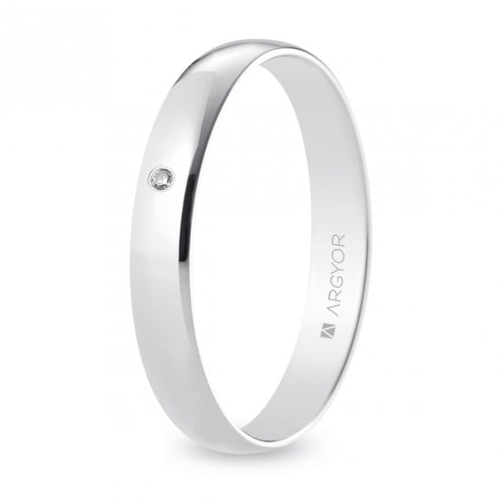 Alianza clásica de oro blanco de 18k con acabado pulido brillante y un diamante de 0,01 quilates (color H y pureza SI). Una joya elegante que podrás llevar a diario como símbolo de amor.Disponible también sin diamante y en oro amarillo.Corresponde a la referencia del configurador de alianzas B35RP1D