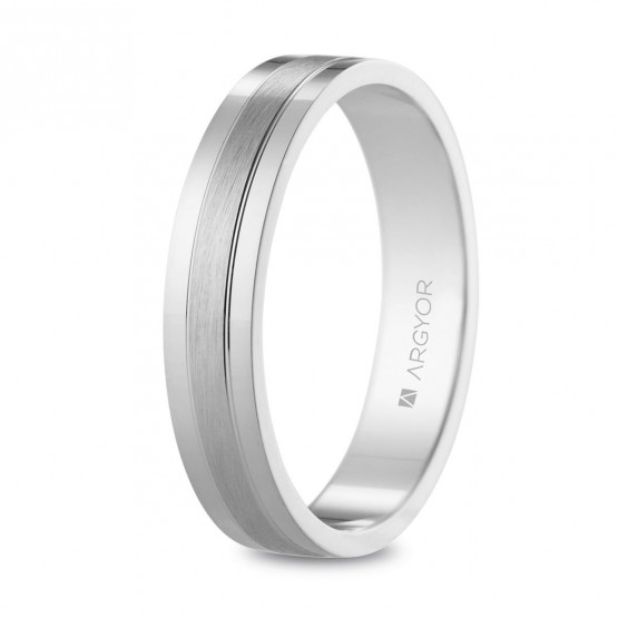 Alianza de oro blanco de 18 quilates y 4 mm de ancho, con un elegante diseño plano que combina el acabado brillo de sus dos bandas laterales con el acabado scotch/satinado de la central.Nuestros maestros joyeros ponen todo su saber hacer en cada joya Argyor, para que sea el símbolo perfecto de vuestro amor.