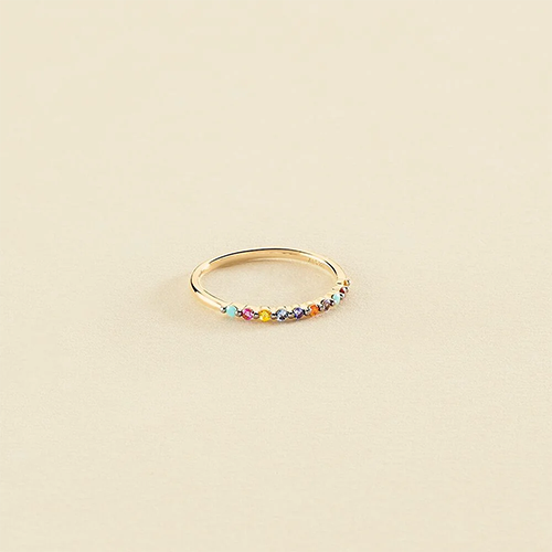Anillo fino de plata de ley bañado con 1 micra de oro de 18k y circonitas. Una opción ideal para combinar con los que ya tienes y dar el toque de brillo definitivo a tu mano. ¿Dorado con cristal o multicolor? Difícil elección…