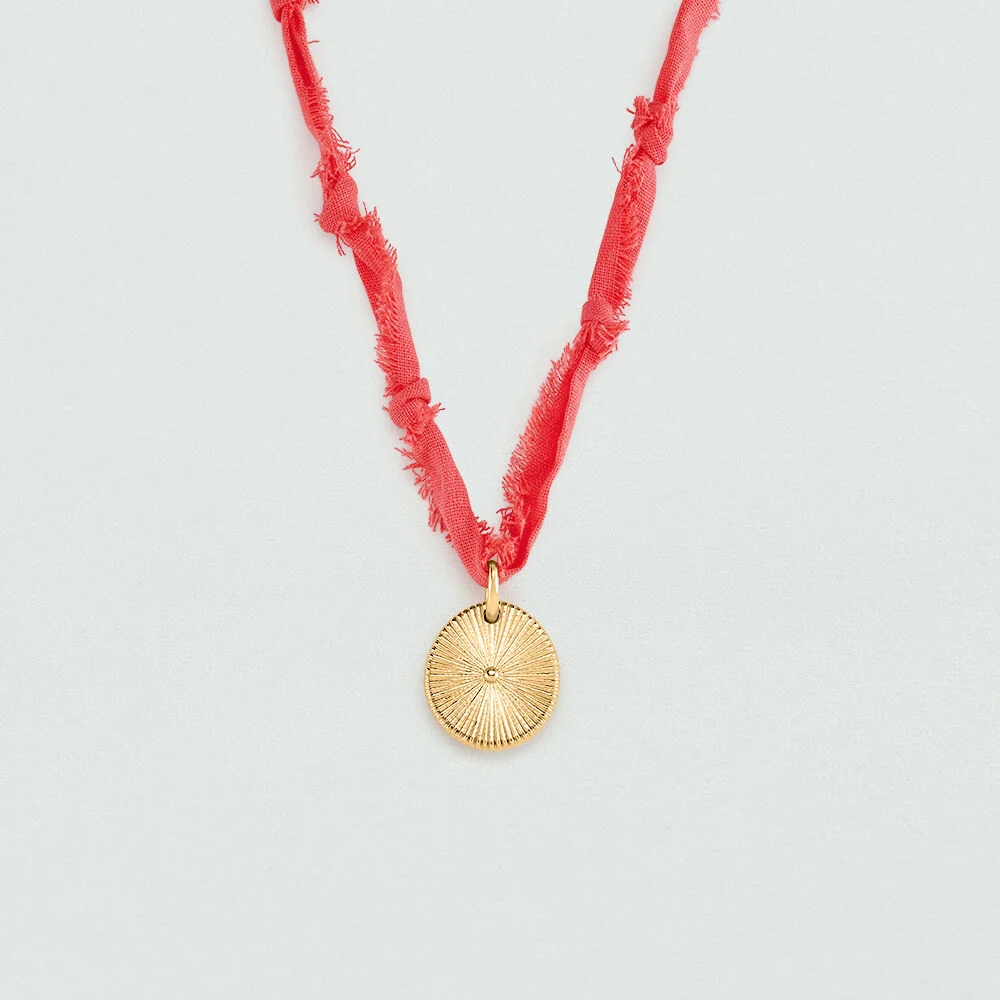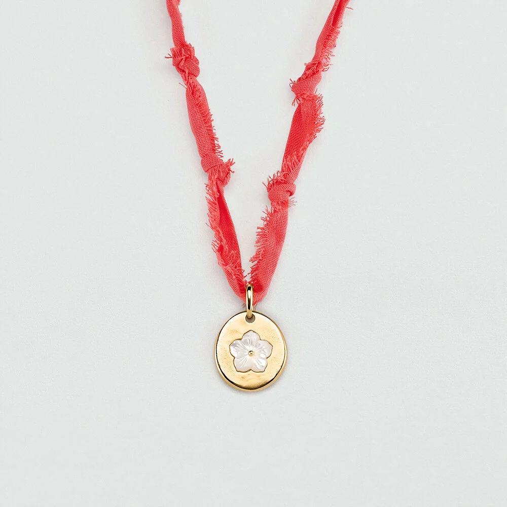 Collar de tela en color coral con medalla acabada en oro y flor de nácar en el centro. Una joya tan cómoda, versátil y colorida que no te la querrás quitar. La flor de Tiaré es una flor tahitiana que florece a la vez que el verano: de mayo a septiembre. Disfruta de la mejor época del año en forma de joya con la nueva colección de Maria Pombo X Agatha.