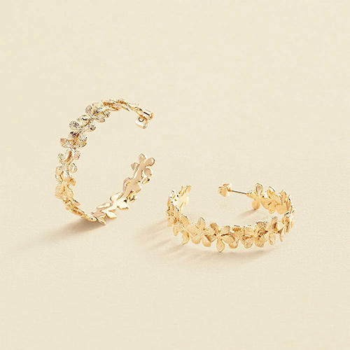 Criollas acabadas en oro con múltiples flores. El volumen y la textura de las flores lo convierten en una pieza realmente especial y bonita. Lúcelos con vestido, cuello de camisa o camiseta, vestirán todos tus outfits de una forma sutil y muy romántica. Una auténtica oda al romanticismo que querrás llevar a todas horas.