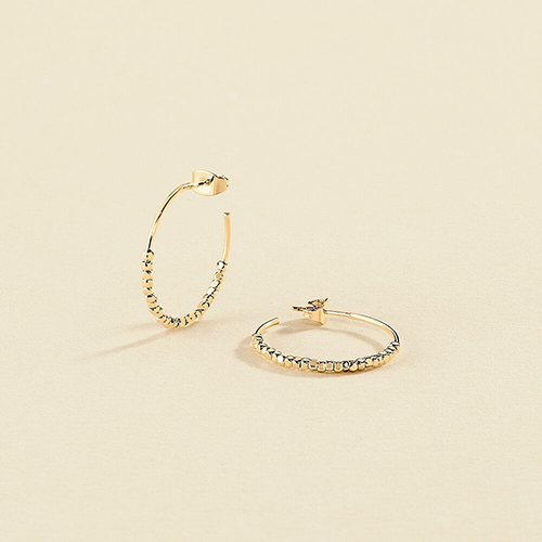 Criollas de 25mm acabadas en oro de 18k con perlas de metal enfiladas. Revisitamos nuestras criollas de siempre y les damos un twist de originalidad que las vuelve de lo más atractivas. Las querrás llevar a todas horas, ¡prometido!
