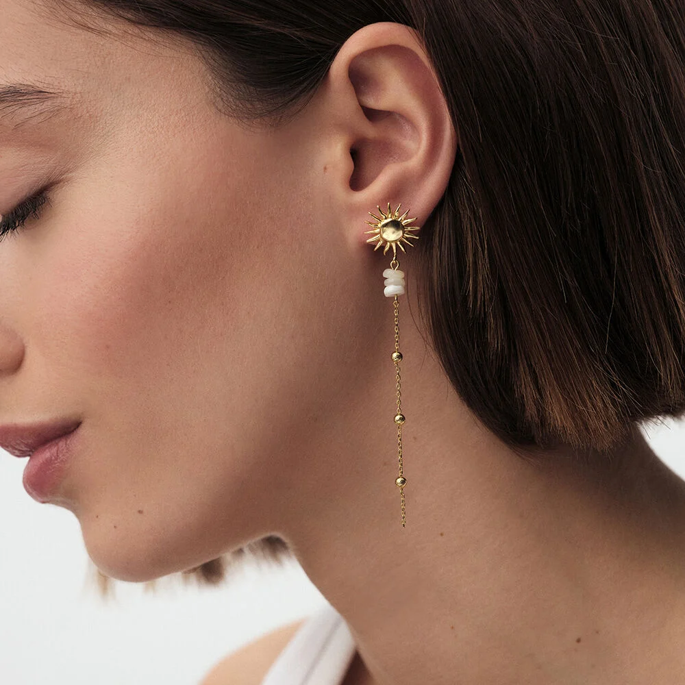 Pendientes largos acabados en oro con sol y cadena. La cadena tiene bolitas salteadas y 3 perlas de nácar, que le dan un toque súper especial. Un complemento perfecto para llevar de día y de noche y dar el toque definitivo a cualquier outfit. La flor de Tiaré es una flor tahitiana que florece a la vez que el verano: de mayo a septiembre. Disfruta de la mejor época del año en forma de joya con la nueva colección de Maria Pombo X Agatha.