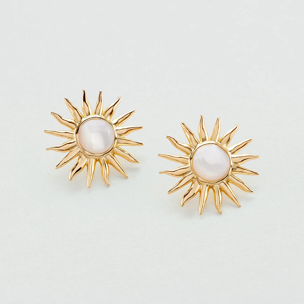 Pendientes acabados en oro en forma de sol. El sol lleva nácar en el centro. Esta joya lleva escrita la palabra verano y querrás lucirla sin descanso. La flor de Tiaré es una flor tahitiana que florece a la vez que el verano: de mayo a septiembre. Disfruta de la mejor época del año en forma de joya con la nueva colección de Maria Pombo X Agatha.